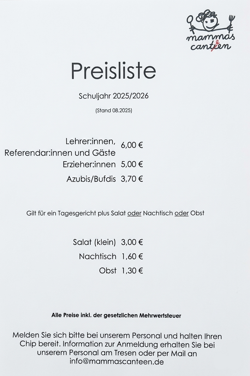 Die aktuellen Preise für das Mittagessen entnehmen Sie bitte der folgenden Übersicht: